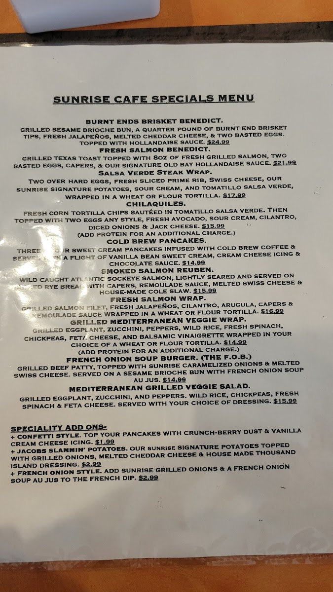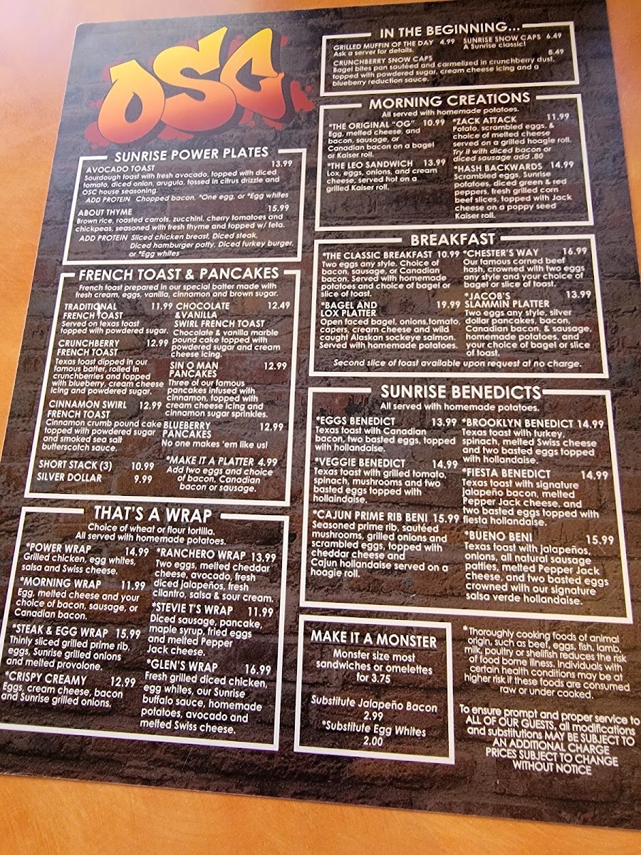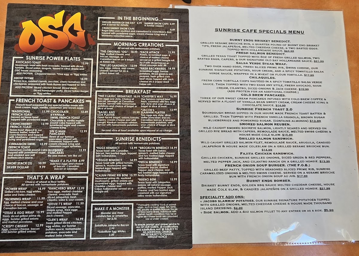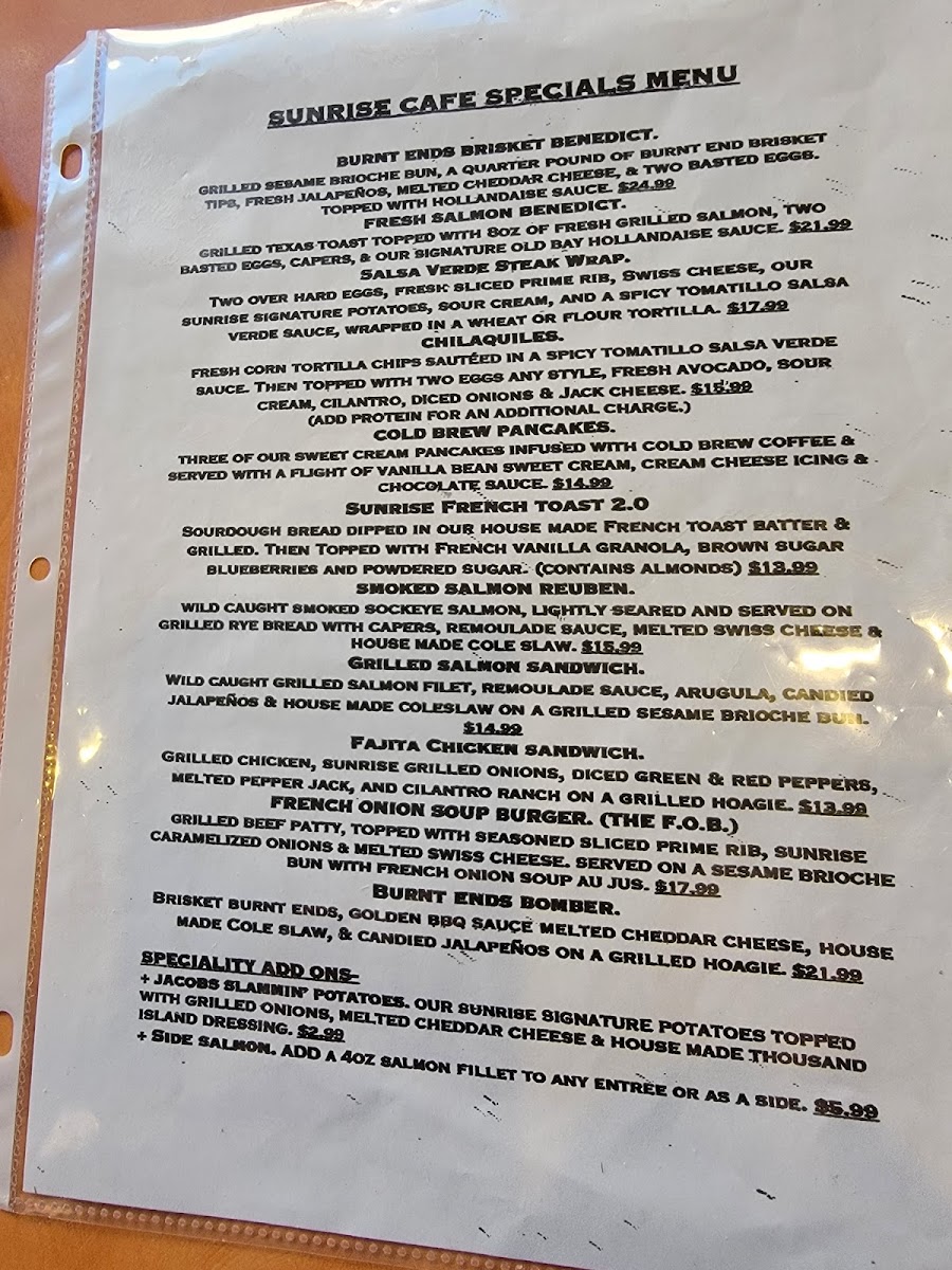 The Original Sunrise Cafe Menu