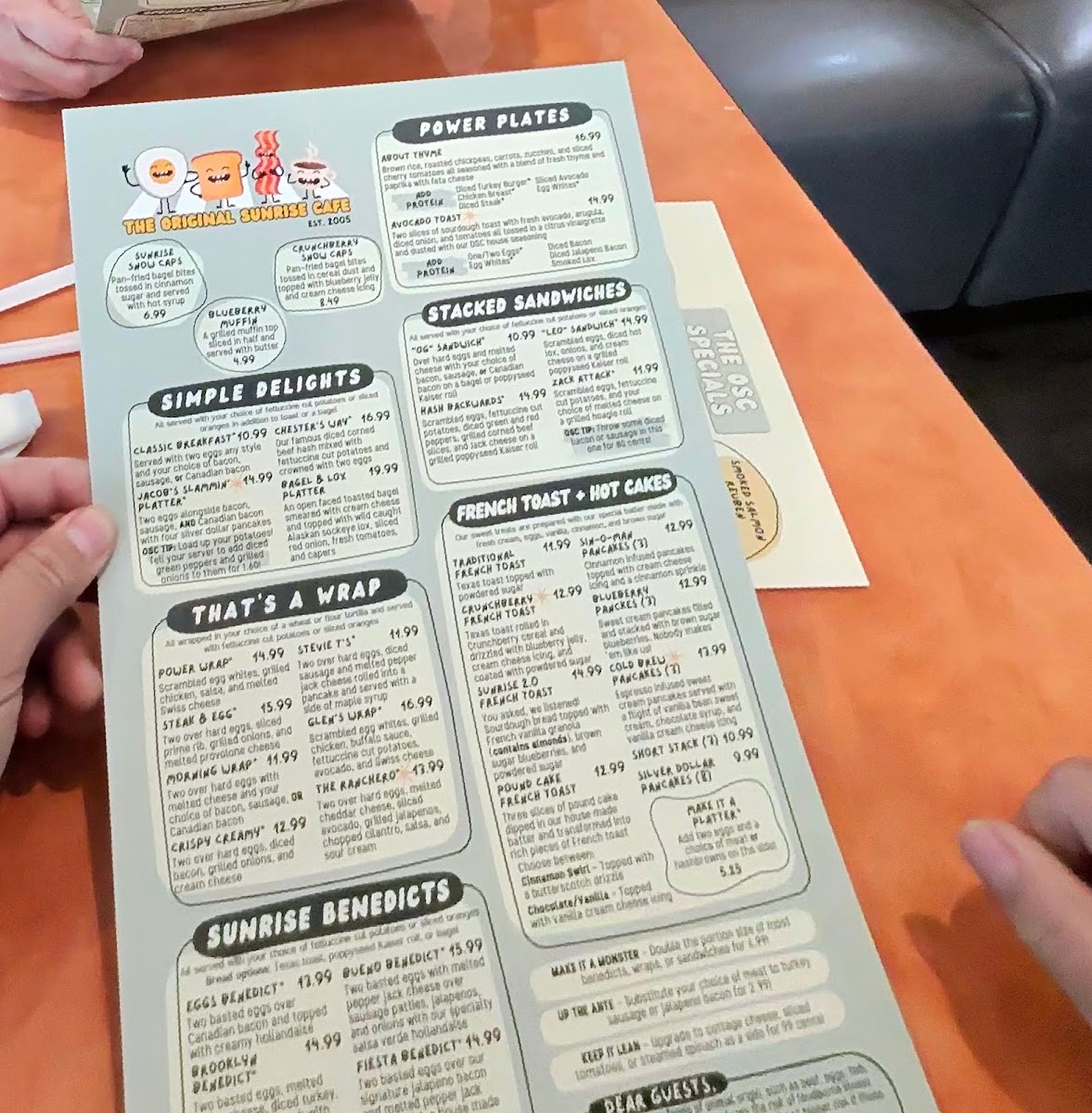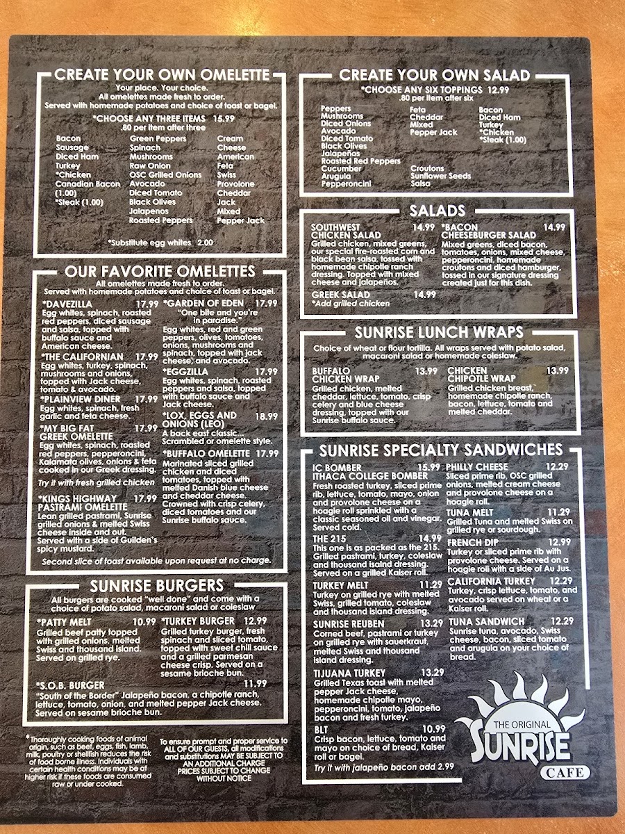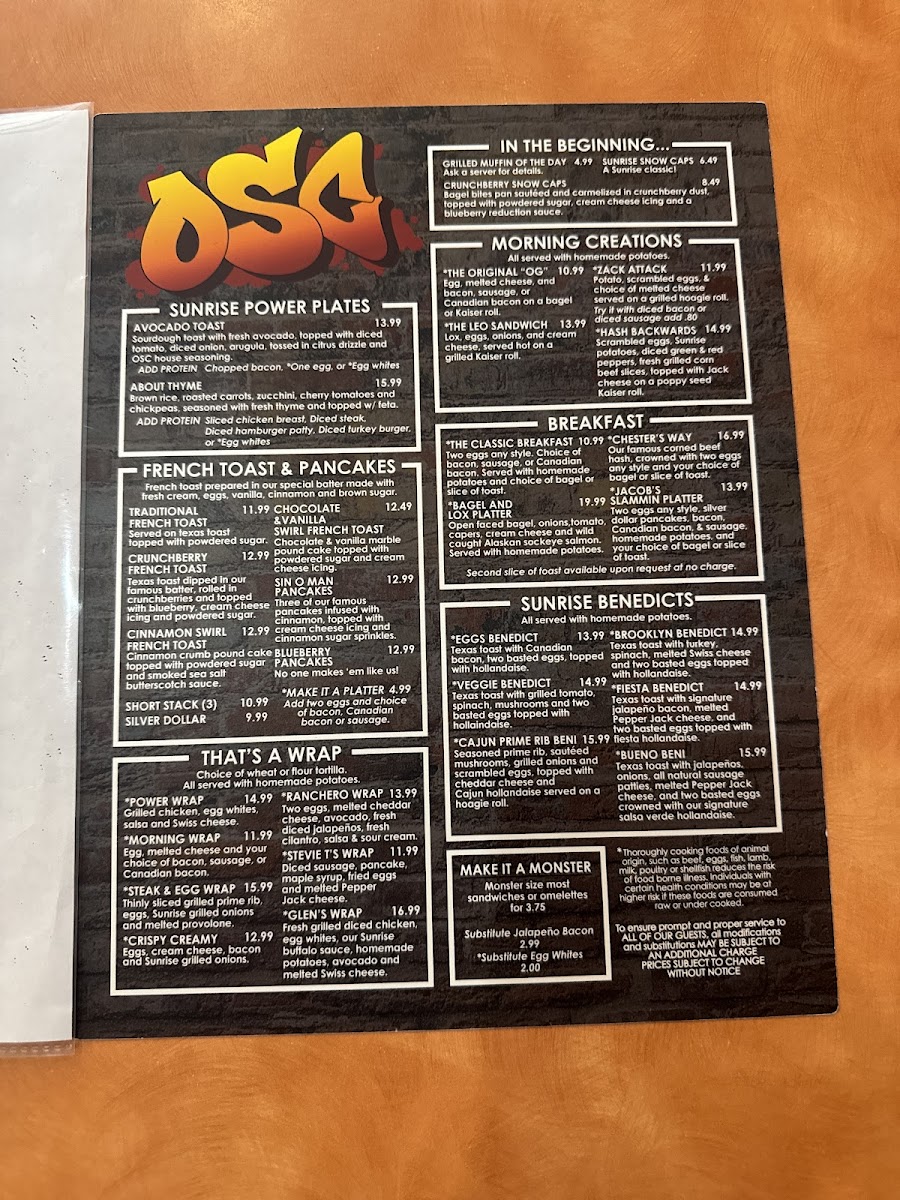 The Original Sunrise Cafe Menu